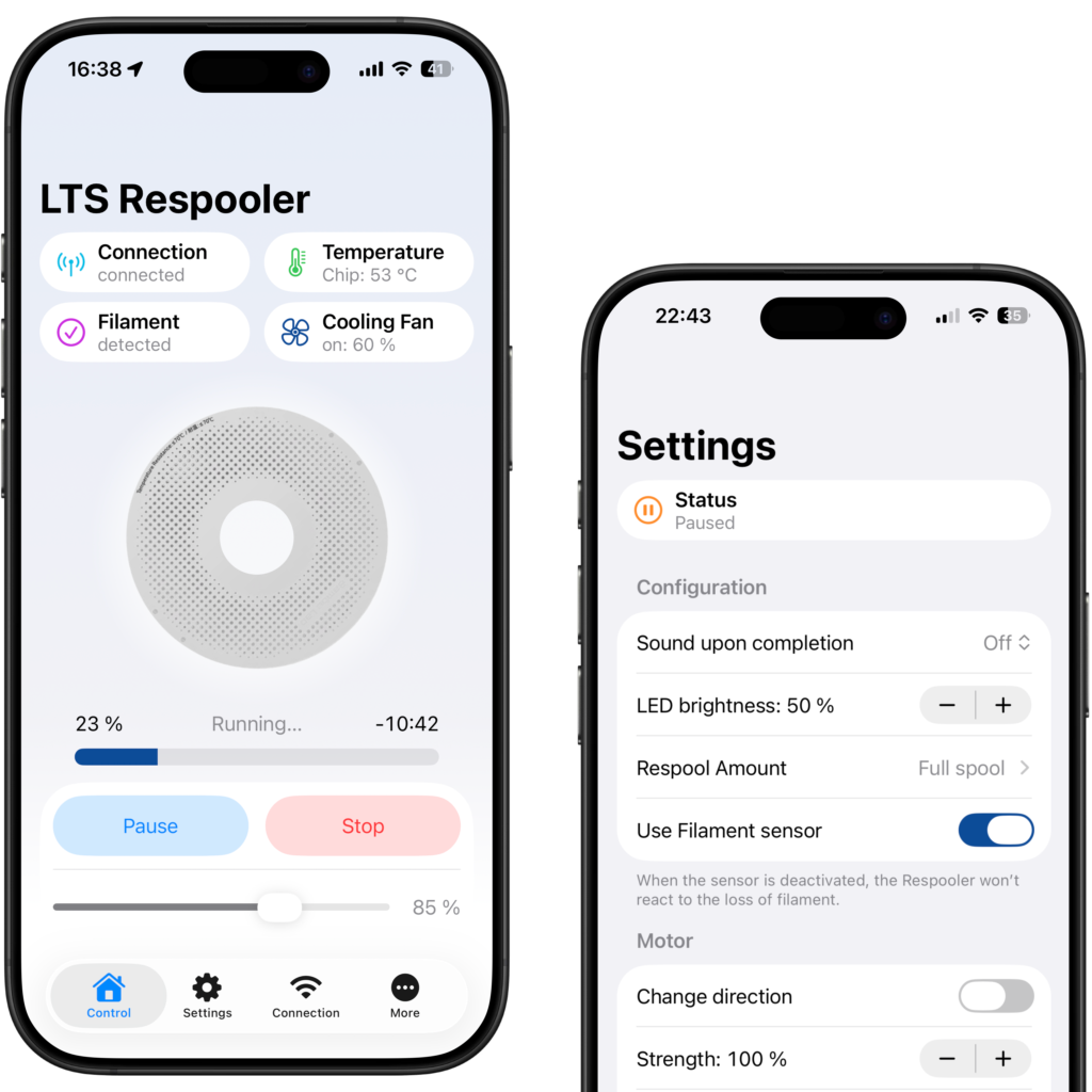 Mostly for fun, you are now able to control the Respooler using an App! Works with the ESP32 PCB and the Control Board. Pictured is the most recent App interface. Join on TestFlight for beta access.