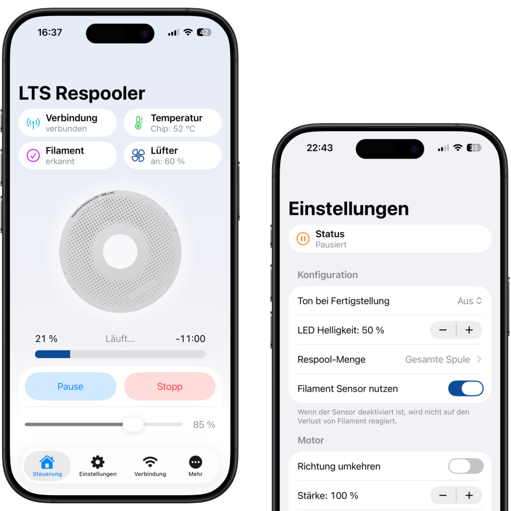 Das Control Board und die ESP32 PCB sind mit der LTS Control App kompatibel! Das Bild zeigt die neuste Version der App-Oberfläche. Tritt TestFlight für Beta Updates bei.