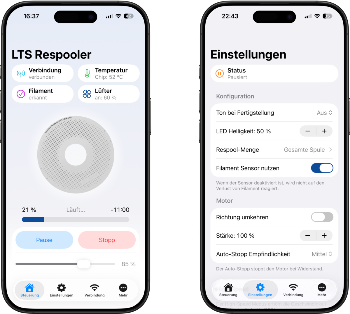 Die LTS Control App ermöglicht es dir, den Respooler zu konfigurieren und zu steuern! Passe Motorstärke und Geschwindigkeit and oder aktiviere den Auto-Stopp. Auch kabellose OTA-Updates sind damit möglich.