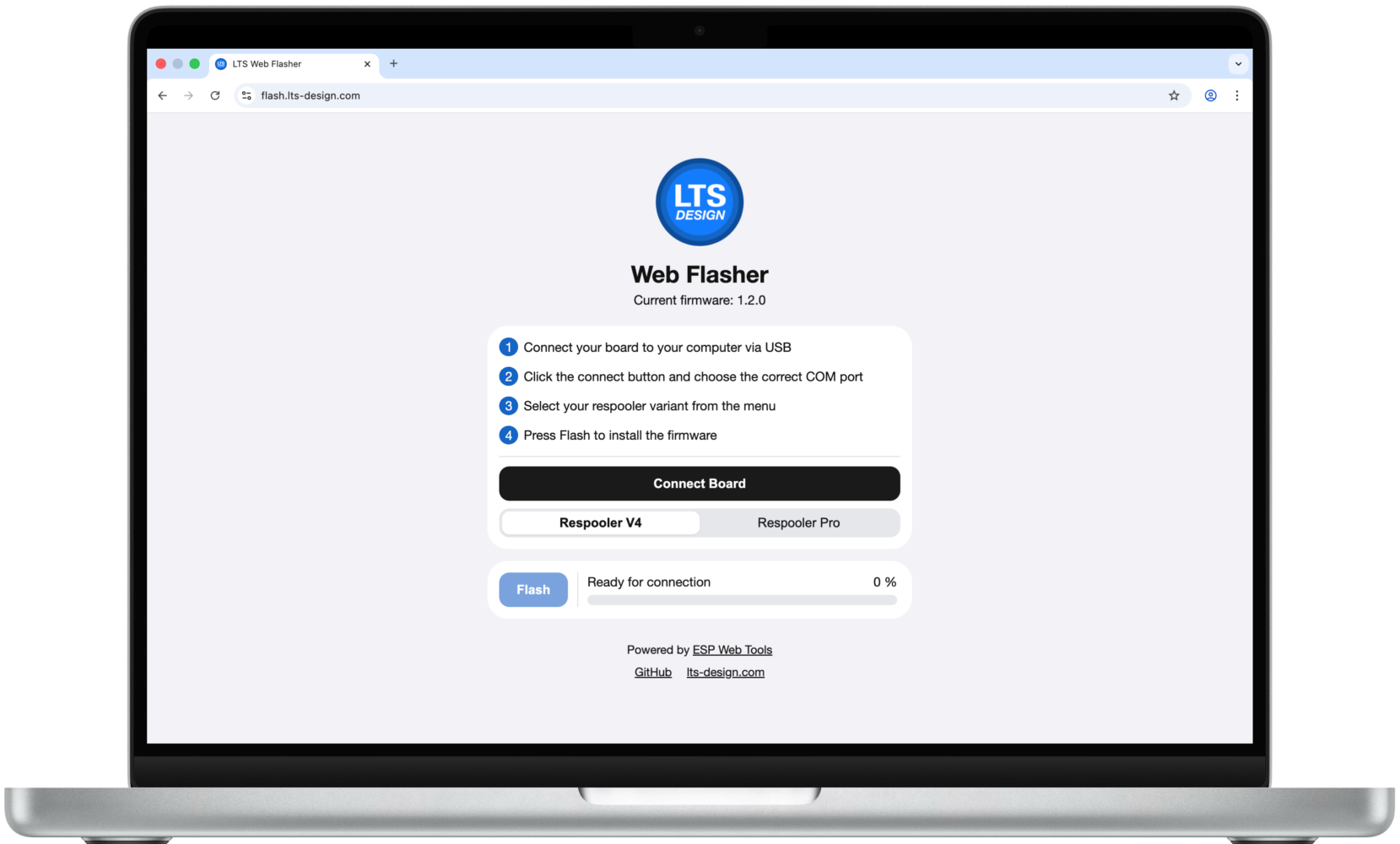 Easily flash the latest firmware for the LTS Respooler to your ESP32 or LTS Control Board. Directly from your browser!