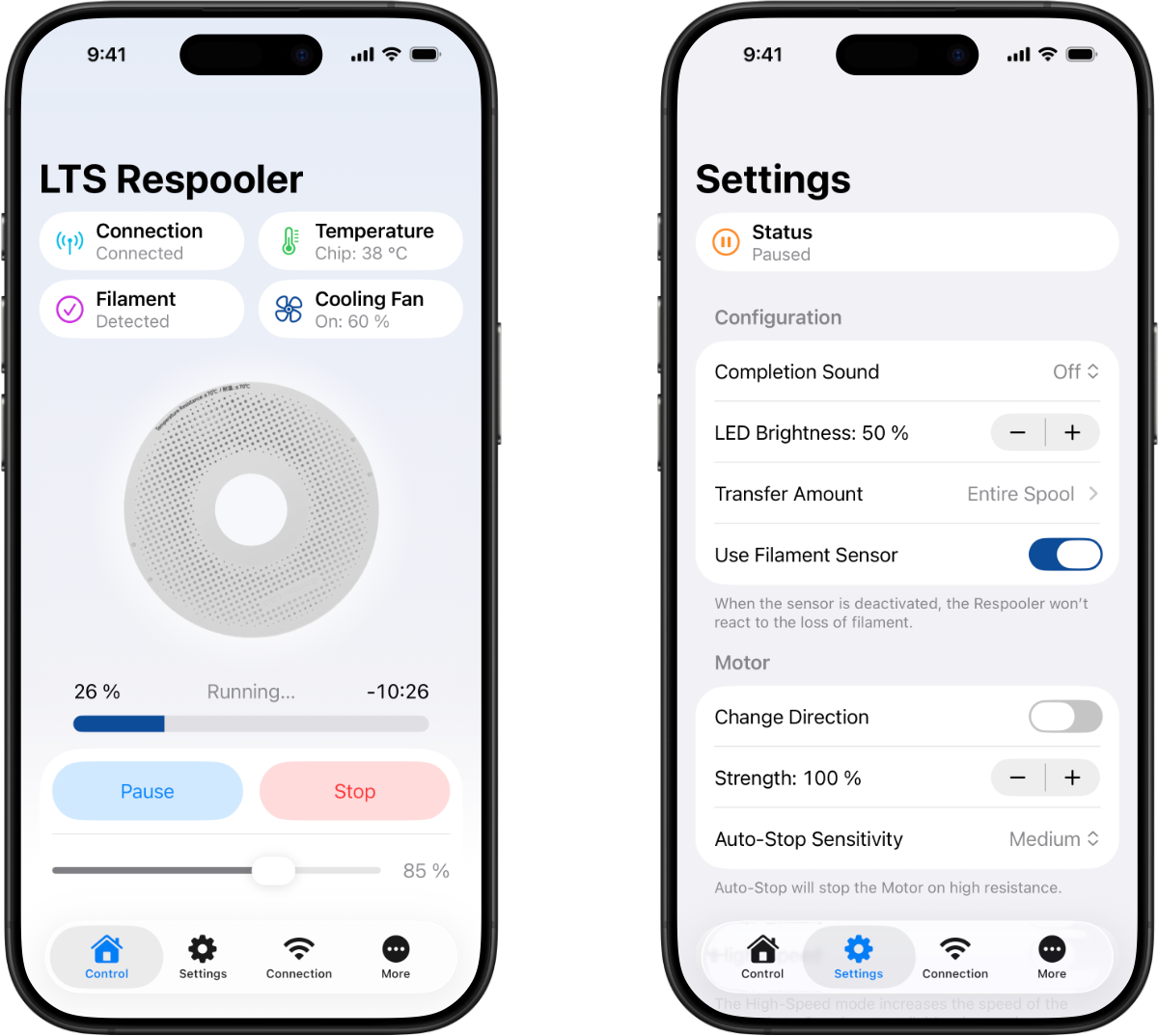 The Control app lets you easily control and adjust your Respooler! Configure the motor strength, adjust the speed or enable Auto-Stop. The app also lets you wirelessly update the Respooler firmware.
