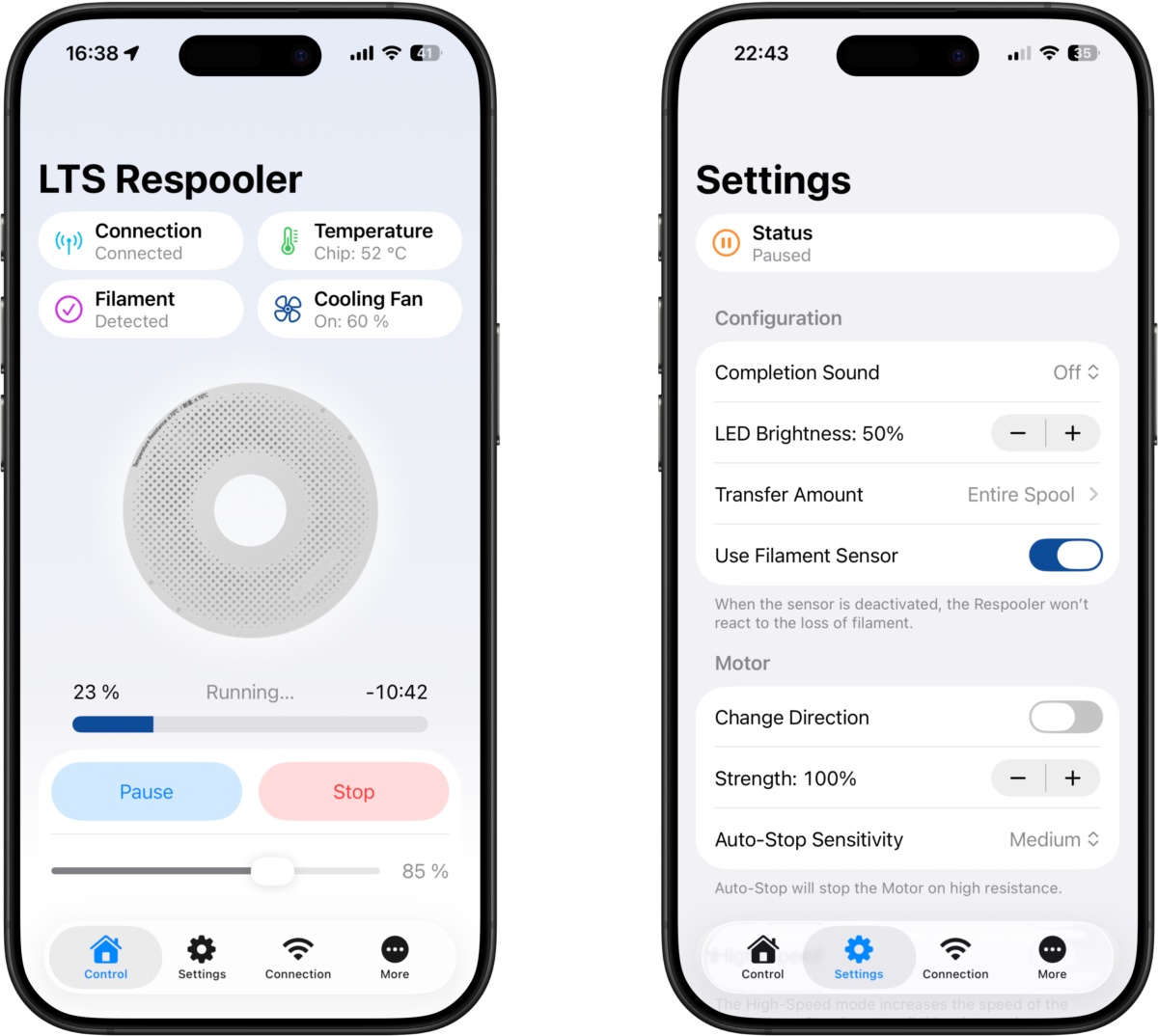The Control App lets you easily control and adjust your LTS Respooler! Configure the motor strength, adjust the speed or enable Auto-Stop. The App also lets you wirelessly update the Respooler firmware.